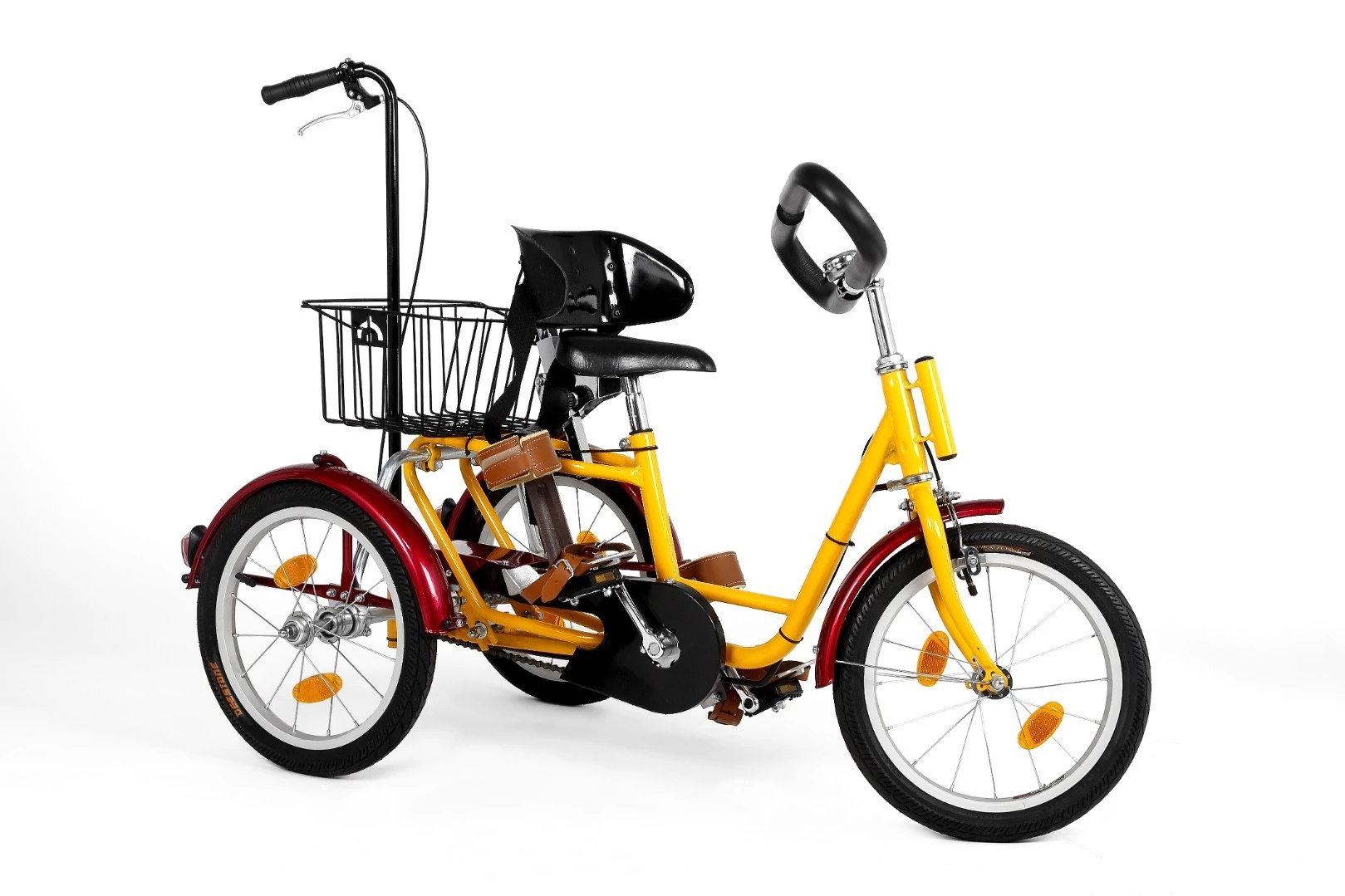 The Reha Tricycle can be fitted with a variety of accessories to support the body, head, and feet. These include hip and thoracic supports, footplates (sandals), ankle-foot orthoses, chest pads, steering solutions, various handlebar styles.